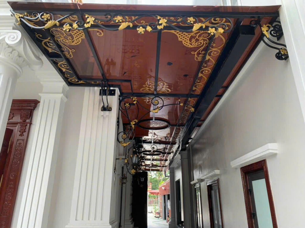 Mái che hiên kính không chỉ che nắng mà còn tăng tính thẩm mỹ. Kết cấu khung sắt mỹ thuật bền vững, hoa văn tinh xảo phù hợp với biệt thự và nhà phố.