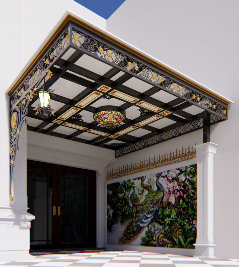 Mái kính sắt mỹ thuật là một điểm nhấn kiến trúc ấn tượng. Khung sắt nghệ thuật, với các hoa văn CNC tinh xảo hoặc sự kết hợp độc đáo của kính màu (ví dụ: Mái kính màu xanh đen), mang lại nét sang trọng và khác biệt. Vẻ đẹp của sắt mỹ thuật còn được thể hiện đồng bộ qua các hạng mục khác như lan can sắt mỹ thuật, góp phần nâng tầm giá trị thẩm mỹ cho toàn bộ công trình.
