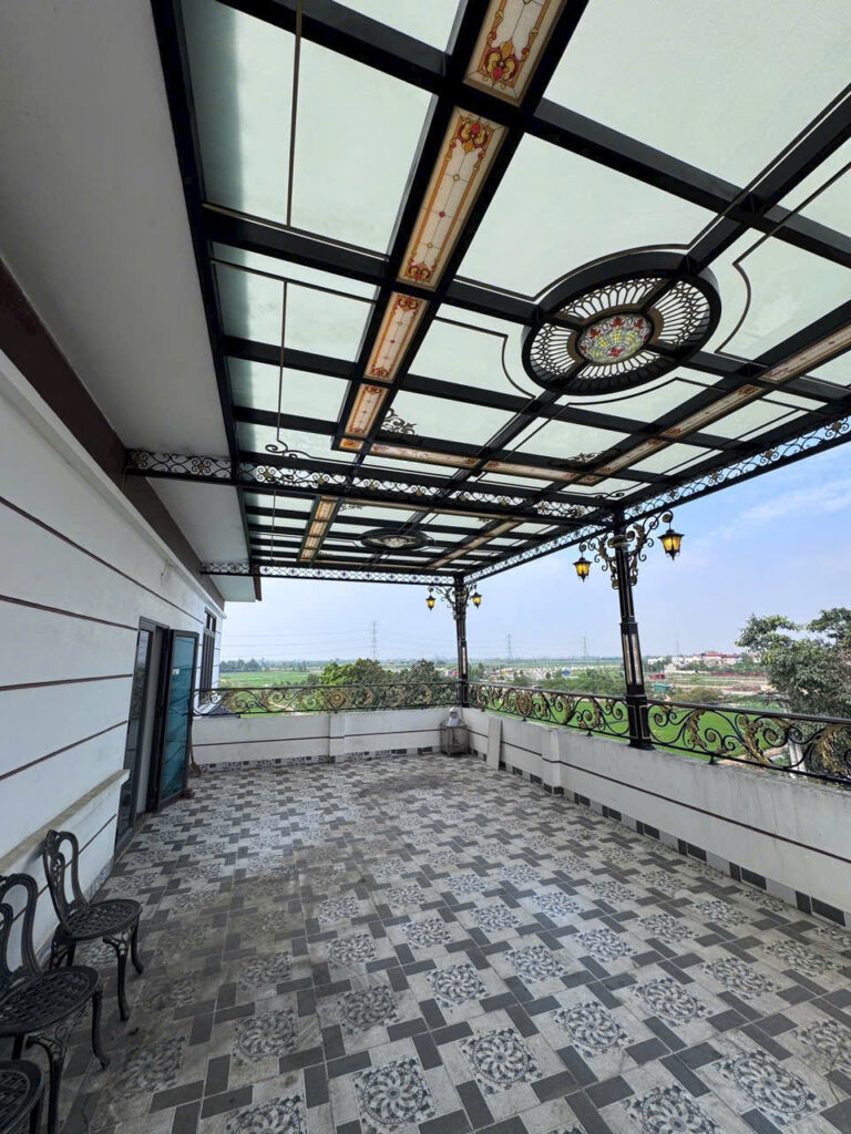 Mái kính tầng thượng bảo vệ không gian trên cao, tạo sự thông thoáng. Sắt mỹ thuật HD thiết kế khung sắt họa tiết, kết hợp kính cường lực bền chắc.