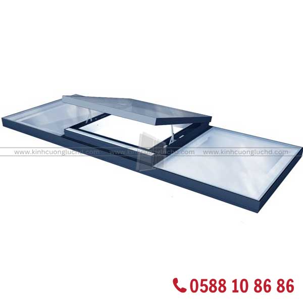 Mái kính mở hất vận hành bằng motor, đóng mở theo trục bản lề. Thiết kế này phù hợp cho giếng trời nhỏ, cửa sổ, nơi cần thông gió nhanh và che mưa kịp thời.
